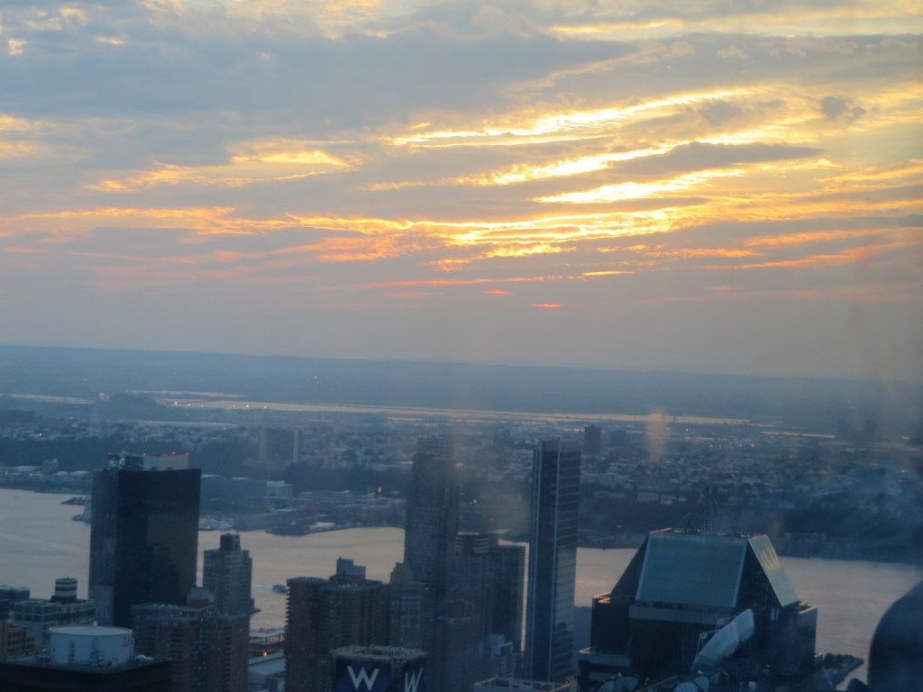 Through the crowds, I saw the Empire State Building, the tiny Times Square far below, and away in the distance, Elis Island with the Statue of Liberty, all illuminated in the light of the setting sun. With some work and smiling, I made it to the glass pane where I got a wonderful view of the city underneath the sun, the fluffy clouds turned a soft orange and pink.