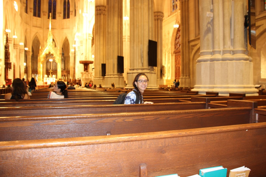 We continued walking, gazing up at the mesmerizing buildings whenever we could. The height was dizzying, though whether it was because I was exhausted or not I would have to find out later. Finally, standing elegantly in the middle of all the metal and steel, I caught a glimpse of St. Patrick’s cathedral, all white and glistening in the sun, as if it was popped out from somewhere in Europe and placed in the crowded city.