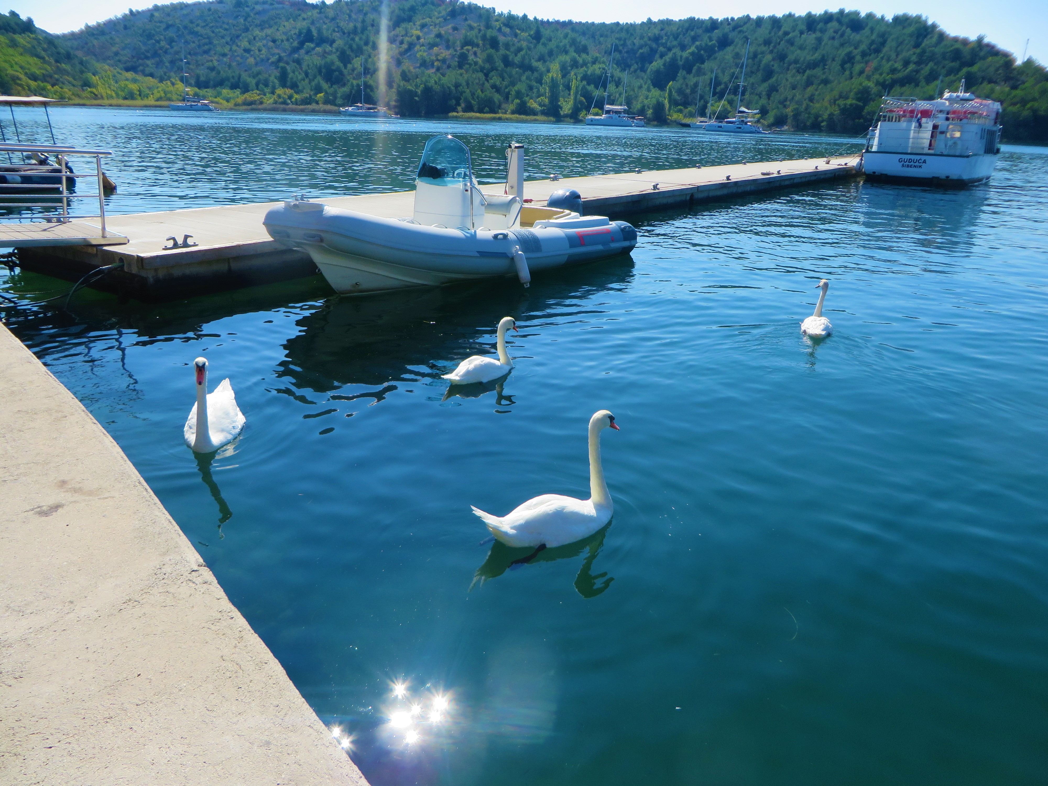 From the trails around a lake near my home, one can sometimes catch a glimpse of a lone swan. All the hikers ooh and ah, and snap many pictures of this celebrity. So when, while we were waiting for the ferry in Krka National Park, Croatia, I saw at least eight swans, I took an unconscious step forward in amazement.