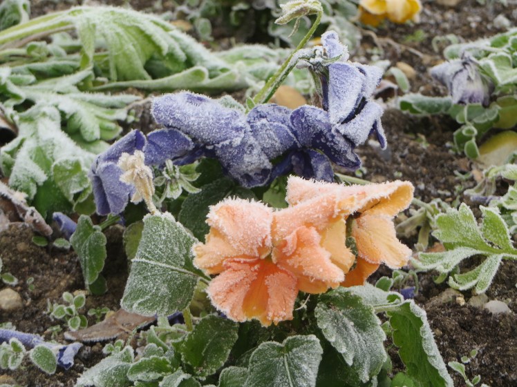 Finally we entered the village of St. Emilion, my gloveless hands (gloves were another article of clothing I had imprudently not taken with me) shivering even from inside my coat’s pockets. Probably because I couldn’t resist stroking some frosted flowers drooping so remorsefully in the cold.