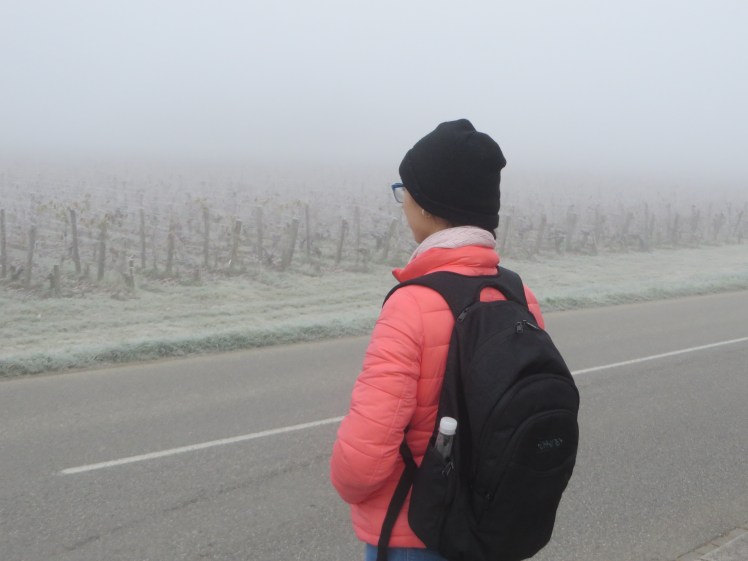 The walk was not as magical as the first one, mainly because it was just as cold, but with no more fog and frost. I was able to see the vineyards and some chateaus beyond, with the fog gone, but it wasn’t the same, though you couldn’t tell from my cheery, dorky, pathetically cold face.
