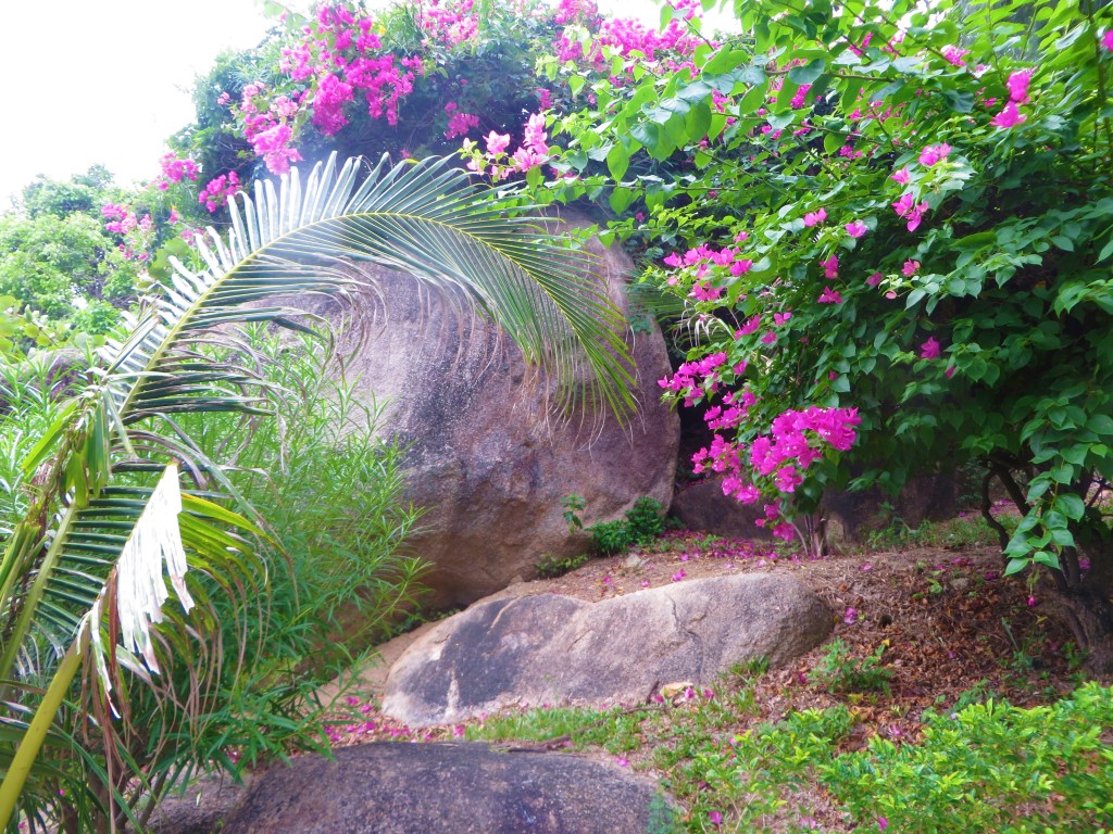 The sun starts to rise and we know it’ll be hot soon, so we head back and get a few last surprises. The vine covered boulders are so irresistibly beautiful, with purple flowers dotting them. Lush green plants line a high staircase, with bright pink tropical flowers curling out to say hello.