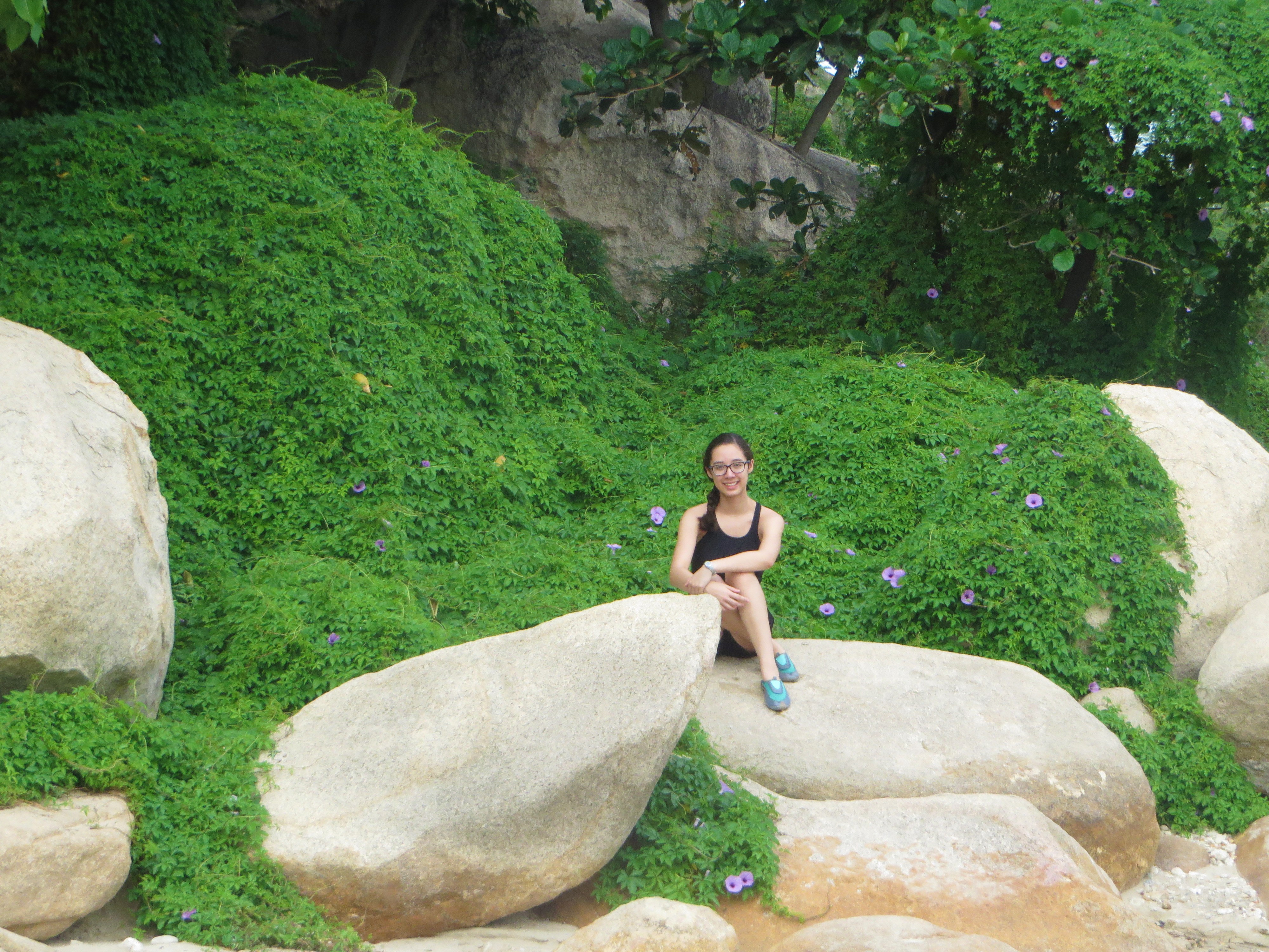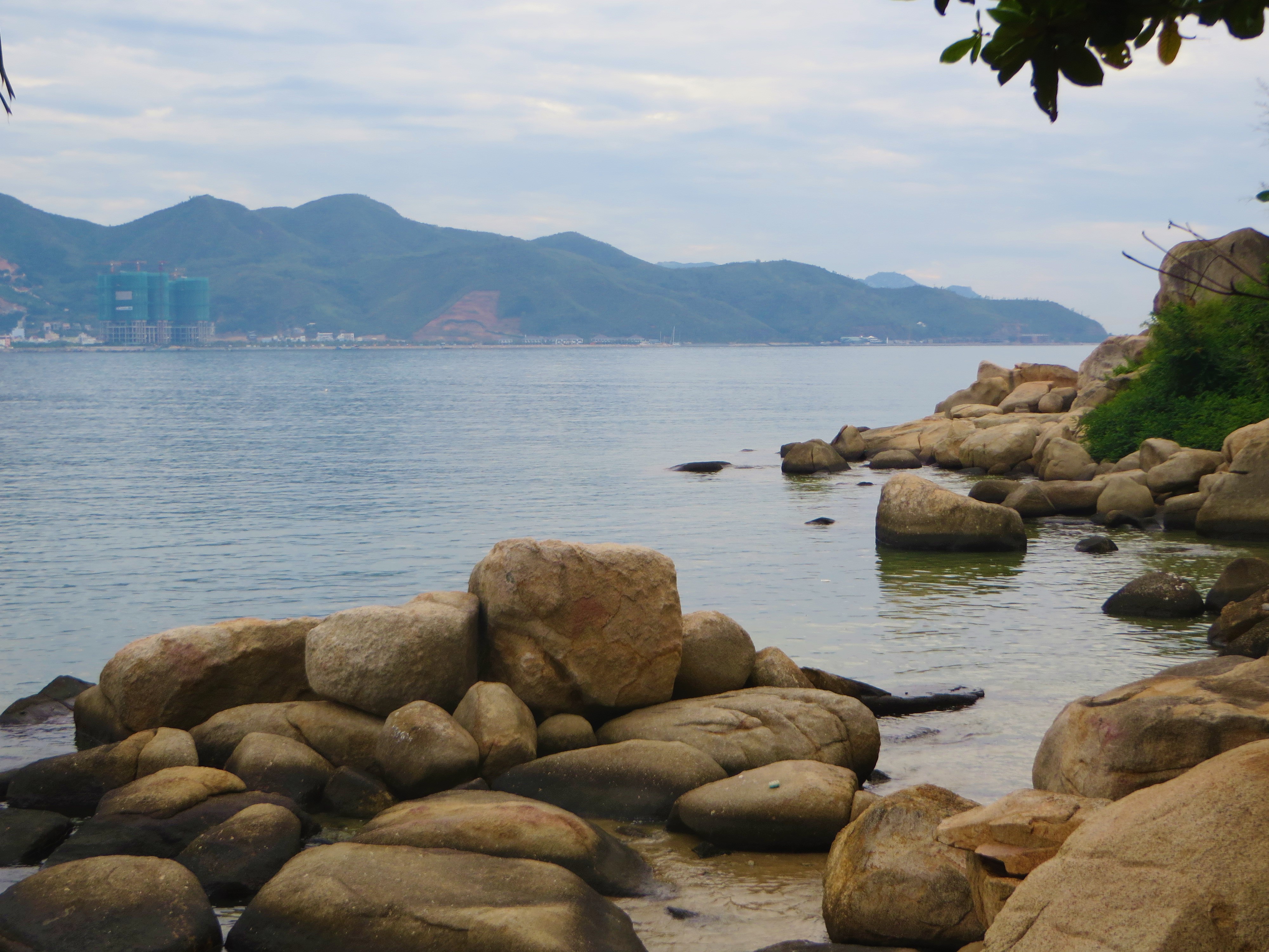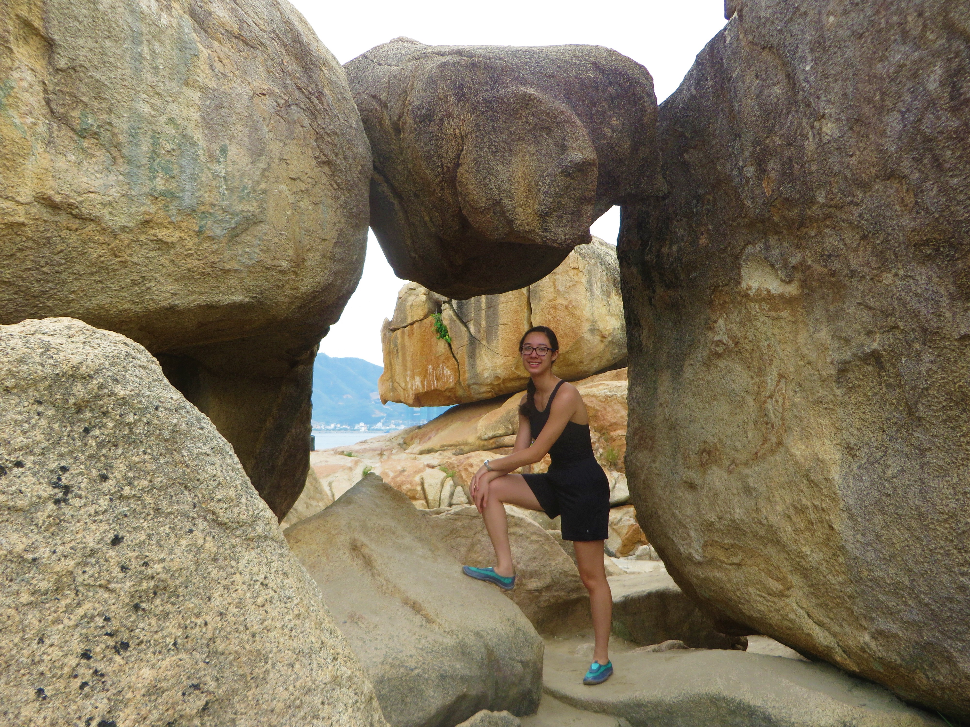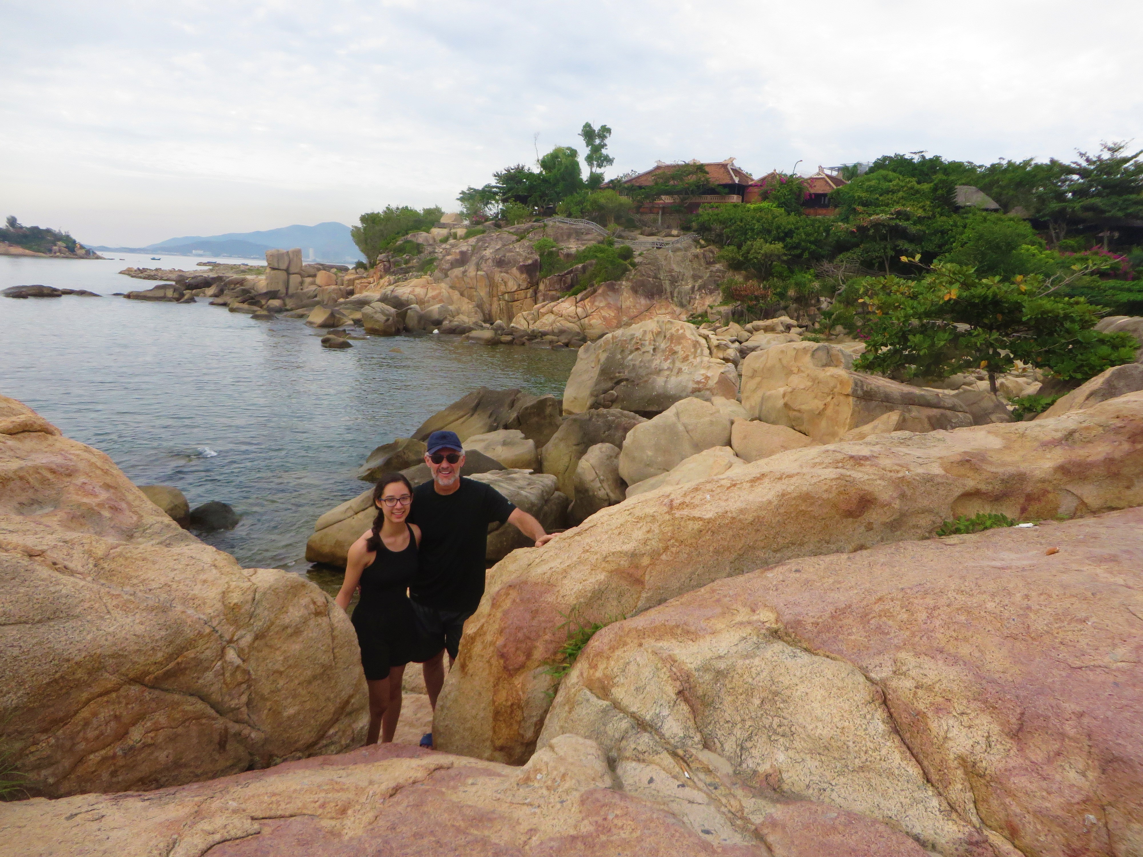 So we head to the water, Mama and Micah heading to the left to swim, Papa and I heading to the right to explore those boulders in the distance that are so irresistibly calling to me to climb. Hòn Vợ Chồng, or the Couple’s Rocks.