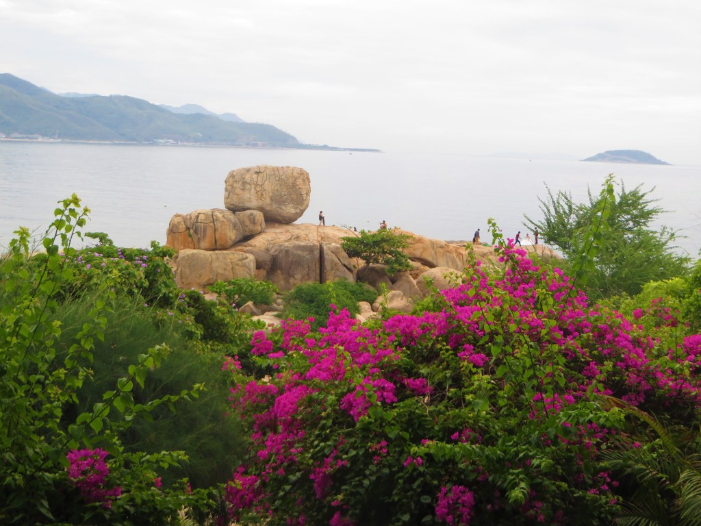At the top of the staircase, I glance back and see the whole Hòn Vợ Chồng with the ocean in the back and hot pink flowers in front. This tropical jewel was worth the long journey. It was worth the stifling heat.
